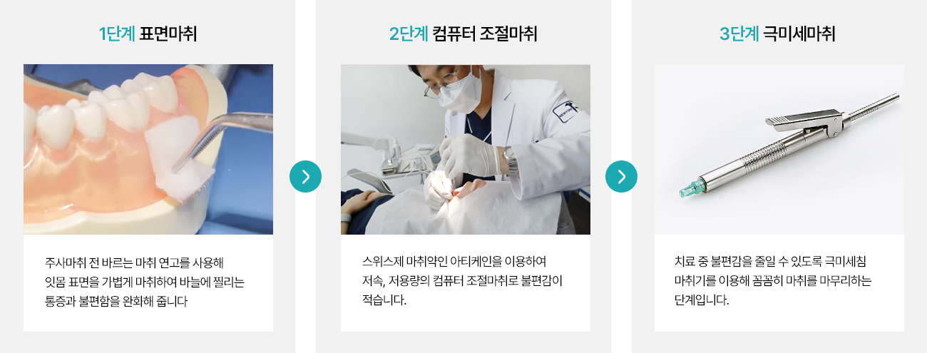 표면마취, 극미세침을 이용한 펜슬마취, 컴퓨터마취 등 3단계 맞춤형 마취 시스템으로